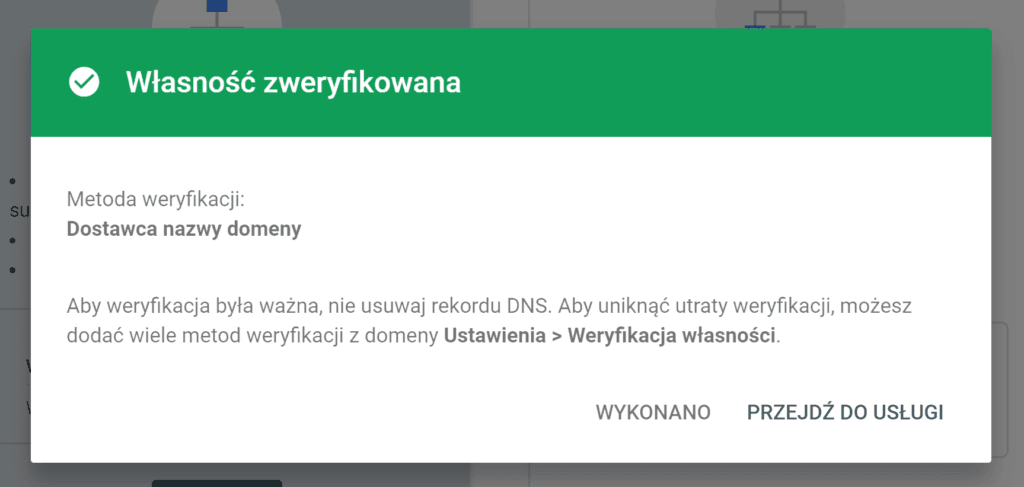 Jeśli pojawi się okno jak powyżej – wszystko przebiegło pomyślnie. Teraz już można przejść do usługi. Pamiętaj, że trzeba dodać stronę w większej ilości wariantów tj. z „www”, „http://”, „https://” , a nawet subdomeny np. twojastrona.shop.pl